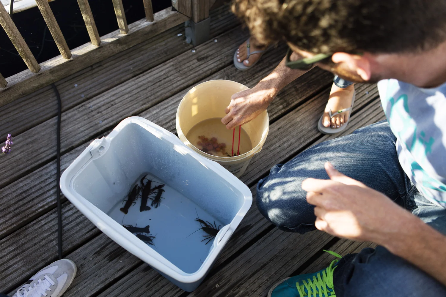 Zodoende kopen we (enigszins illegaal) een fuik en rijden we op een mooie dag in juli richting het huis van Linda en Jeffry. Daar zijn ze op de bodem van een meertje direct zichtbaar: kleine, nogal agressief ogende mini-kreeften, die bij de minste beweging 5 meter verderop gaan zitten. Onze enthousiaste vrienden vullen de fuik met magische krab-balletjes en we mogen ‘m zelf strategisch plaatsen.
