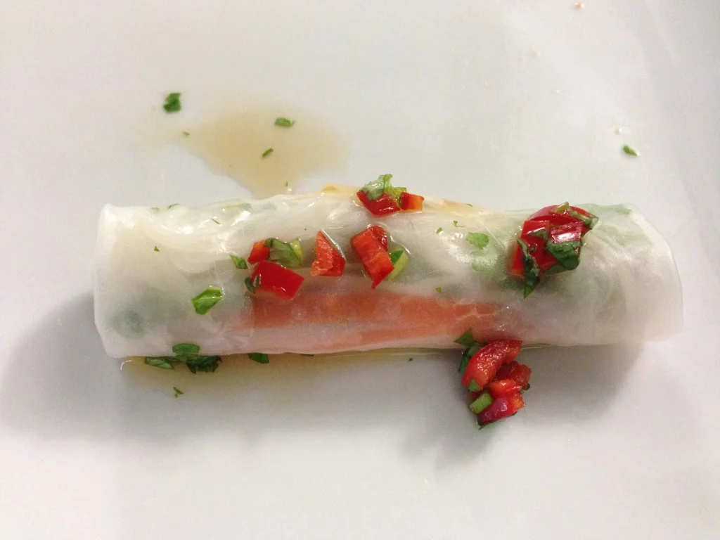 Kook de rivierkreetjes 8 minuten in gezouten water, laat afkoelen en pel ze. Week de rijstvellen in water en leg op de onderste helft van ieder rijstvel 2 kreeftjes, wat noedels, basilicum, koriander, wortel, taugé, en limoenschil. Vouw de linker en rechter kant van het rijstvel naar binnen en rol het vel van onder naar boven strak op.